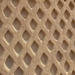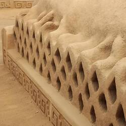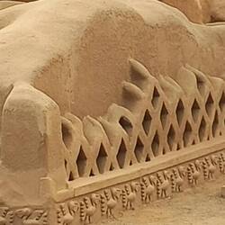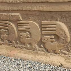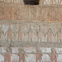 The elaborate decoration on the walls of Chan Chan reflects the importance of water, particularly the sea, played in Chimú culture.  The high reliefs represent fish, facing north and south, which can be interpreted as representing the two currents that mark the Peruvian coast - the Humboldt current, cold, coming from the south, and the El Niño current, warm, coming from the north.  There are also waves, rhombitos (fishing nets), pelicans, and anzumitos (a mixture of sea lion and otter).