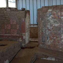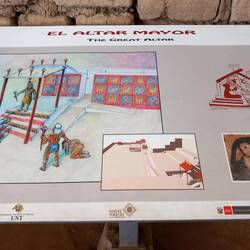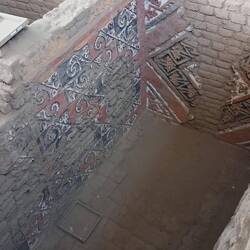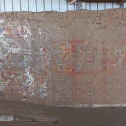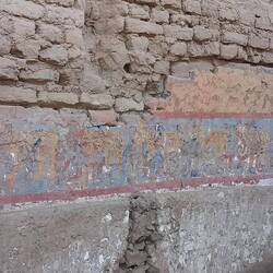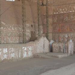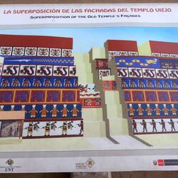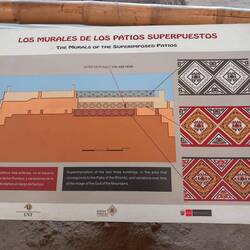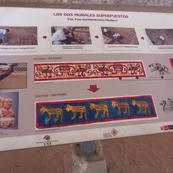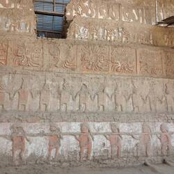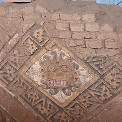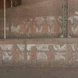 Today, the Huaca de la Luna is coloured the soft brown of its adobe brickwork.  At the time of construction, it was decorated with murals painted in black, bright red, sky blue, white, and yellow.  The sun and weather have faded these murals away.  Panels displayed near each one show visitors how they would have looked.