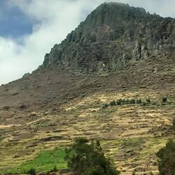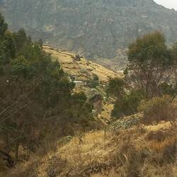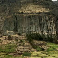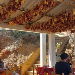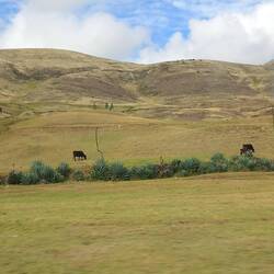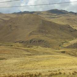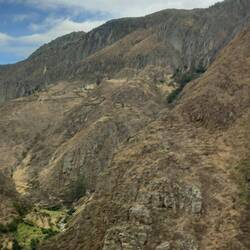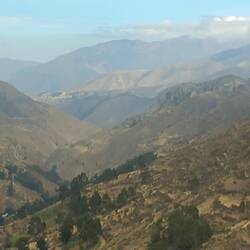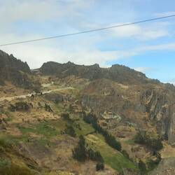 The scenery as we began to ascend into the mountains was stunning!  Photography was difficult as we were pinned into quite a cramped space.  We left the tarmacked road and continued on an unmade surface.  The road was very steep and winding.  After around two and a half hours, we stopped at a roadside cafe for breakfast.  We both had coffee, which turned out to be little more than coloured water, and we shared a cheese roll.  The views made up for it, though!  While we were there, we had to choose a dish for lunch on the way back.  We chose not to go for the spicy guinea pig and opted for chicken and chips instead!