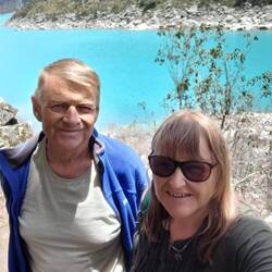 Back on the move, we continued to ascend over rocky roads, passing waterfalls and snow-covered mountains, until we reached the lake we had come to see.  We had to park a short walk away from the lake and had to cross a waterfall to get to the path.  We were both feeling the effects of being at an altitude of 4200 metres and were a bit unsteady on our feet.  Luckily, we made it across without incident!
