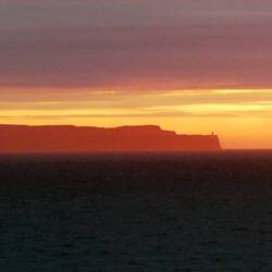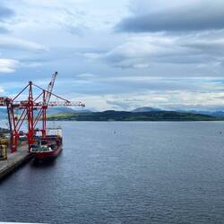 Bei schönster Abendsonne verlassen wir den Hafen von Greenock wieder. Die 2 neuen roten Kräne des Containerhafens wurden von Schulkindern benannt und heißen Taylor Swift und Usain Bolt.