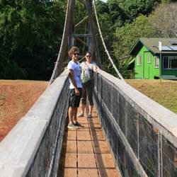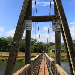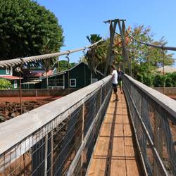 Nach unserem letzten Lookout treten wir den Rückweg an und fahren bis Hanapepe. Hier werden alle hungrigen Mäuler mit Sandwiches und Essen gestopft. Frisch gestärkt machen sich drei Uscholds auf den Rückweg. Wir 3 bleiben in Hanapepe und suchen uns zunächst die Swinging Bridge. Ein wackeliges Holzgestell, dass über einen 'Fluss' aufgehängt ist. Fängt man an auf ihr zu gehen, kommt sie ins Schwingen und die Überquerung wird zu einer außerordentlichen Wackelpartie.