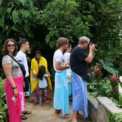 Vorbei an einem 60 Jahre alten Banjanbaum in dem ein wunderschöner kleiner Meditations'raum' mit Figuren gestaltet ist laufen wir Richtung Tempel. Kurz vor dem Tempel gilt das obligatorische Ausziehen der Schuhe.