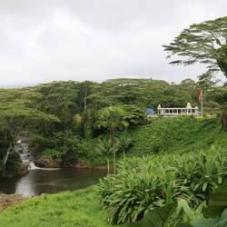 Wasserfall und entfernt einen 'neuen' Tempel der noch im Bau ist.