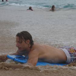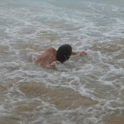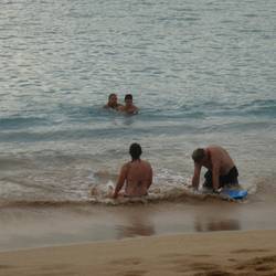 Die Wellen ware heute sehr niedrig im Gegensatz zu vorgestern. Es war kaum Platz für Einstieg, da das Wasser zu tief zum stehen war. Der Sand wurde nach paar Metern zu einem Streifenもっと詳しく