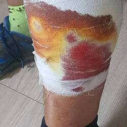 All was going as planned until about 100 meters from the end, when we encountered some neighborhood dogs protecting their turf (when we set the trail, we had passed by these dogs and did not get them too excited), but as the pack rumbled in, about a half dozen of us got to the dogs and slowed down, but Dildo ran ahead and blasted right into the dogs, and the biggest one took offense and grabbed onto his leg, which resulted in a quick trip to the local clinic, 15 stiches, and a couple lifelong scars to talk about. The Sunday hangover trail was mostly a walk around the hotel area, to a local craft cider bar way out there in the middle of nowhere. With the exception of the dog bite, it was a most excellent weekend with a bunch of fun hashers (7 of which got named during the festivities).