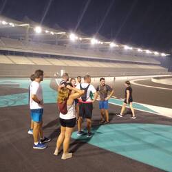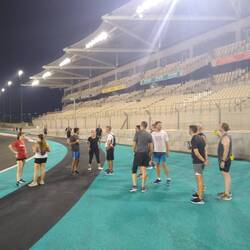 By this time, upon arrival at the venue, Dingbat has explained to me that this will be a special hash event. We are going to be running the outside shoulder of the Abu Dhabi Formula 1 track, that the hares had spent about 2 months coordinating. They were even allowed to put down a few hash marks to ensure we did not get lost (wink wink) (and add a walkers trail to shorten the 3.5 mile trail). As the pack gathers, some brief introductions took place, and eventually all had arrived and we head into the race track with our phones, so that we can get scanned in. 1830 (T -2 hours)