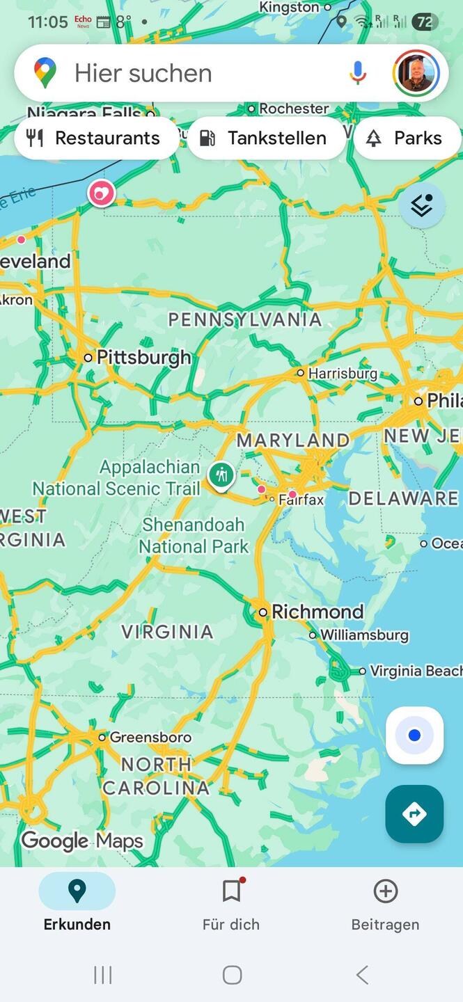 Nachdem gestern noch die vor uns liegenden Strassen "gelb" waren (siehe Screenshot), davor weitgehend "rot" sieht es heute morgen gut aus und wir starten Richtung Washington. 2-3 Tagesetappen liegenRead more