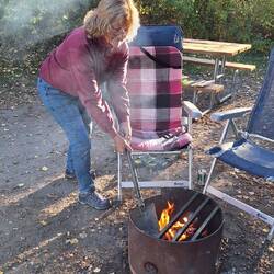 Damit es schnell geht soll es Kartoffelpüree aus der Tüte geben. Also Deckel vom Doppelboden geöffnet und dann - oh Schreck... Tüte angeknabbert. Wir haben also einen "Untermieter" im Doppelboden. Ob es sich um eine Maus handelt? Oder ein Eichhörnchen? Egal, wir müssen nun alles ausräumen, kontrollieren und umpacken. Dann säubern wir die Fächer und die Luftlöcher werden mit Klebeband verschlossen. Das angeknabberte Pulver wird vernichtet und Vera bereitet frische Brei zu. Mittlerweile wird es kühl und dunkel, sodass wir mit über 1 Stunde Verspätung zum kochen kommen und daher unser Essen im WoMo genießen.