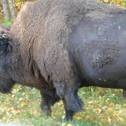 (HD) Noch am Vormittag mache ich, Dieter, eine kleine Wanderung im Nationalpark. Vera hat sich wohl wegen der vielen Klimaanlagen die es überall gibt erkältet und bleibt im Wohnmobil. Der Wanderweg wird wohl auch von vielen Bisons begangen, wie deren "Hinterlassenschaften" belegen. Auch ein Häufchen, das wie Bärenkot aussieht finde ich. Bei der Weiterfahrt steht plötzlich wieder ein Waldbison vor uns am Strassenrand.