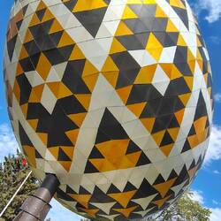 Das Vegreville-Ei ist eine riesige Skulptur einer Pysanka, eines Osterei im ukrainischen Stil. Das Werk von Paul Maxym Sembaliuk besteht aus einem komplizierten Satz zweidimensionaler eloxierter Aluminiumfliesen in Form kongruenter gleichseitiger Dreiecke und sternförmiger Sechsecke , die über einem Aluminiumrahmen angebracht sind. Das Ei, das sich im Wind dreht, ist 9 m lang, dreieinhalb Stockwerke hoch und wiegt 2,5 t.