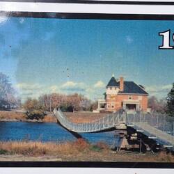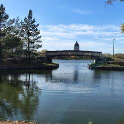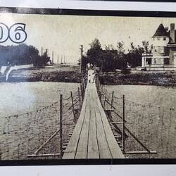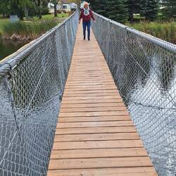 1902 staute die Canadian Pacific Railway den durch den Ort fließenden Bach an, um ihre Dampflokomotiven mit Wasser zu versorgen. Das Gebiet wurde dadurch zu einer "Boomtown". 1905 wurde für 300 Dollar die erste Hängebrücke darüber gebaut, um die Häuser jenseits des Sees mit dem Zentrum zu verbinden. Die Brücke wurde 1954 von einem Zyklon vernichtet, aber 1964 wieder aufgebaut. Auch diese Brücke wurde 1991 bei Ausbaggerung des Sees beschädigt und abgerissen. 2004 wurde die 100 Meter lange Brücke für 250.000 Dollar überwiegend mit privaten Spenden wieder aufgebaut. Auf beiden Seiten gibt es Picknicktische, auf der gegenüber liegenden Seite steht das älteste Gerichtsgebäude Saskatchewan von 1905. Nun ja das älteste Gerichtsgebäude in Deutschland ist das Kammergericht Berlin aus dem Jahre 1468. Aber da Saskatchewan erst 1905 gegründet wurde, ist das schon beachtlich.