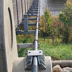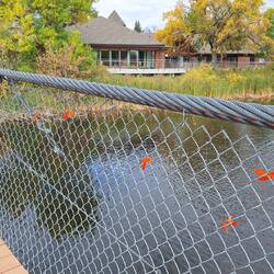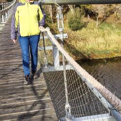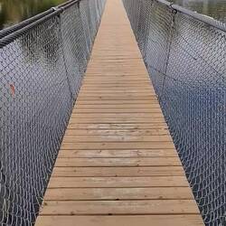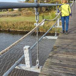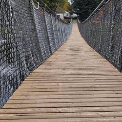 Während in Wolseley die Brücke an dünnen Seilen aufgehängt ist und damit sowohl eine links/rechts Bewegung als auch auf und ab schwingen kann, ist diese Brücke hier mit armdicken Stahlseilen versehen. Die Seile sind noch einmal miteinander verstrebt, erlauben damit nur minimale Seitwärtsbewegung sowie leichte Schwingungen. Es lässt sich hier bequem ohne Bauchkribbeln hinüberlaufen.