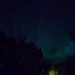 In der Nacht so gegen 1 Uhr werde ich von einem leichten Rauschen geweckt. Erst denke ich an Wind der die Blätter der Bäume zum Rascheln bringt. Ich öffne die Jalousie und sehe pulsierende weiß erscheinende "Wolkengebilde" - die Nordlichter. Ich wecke Dieter, schnappe das Handy und im Schlafanzug flitzen wir hinaus. Direkt über uns diese Gebilde, die auch das Rauschen verursachen. Da es sich ja bei den Nordlichter um elektromagnetische Wellen handelt wundert uns das Summen nicht mehr.
