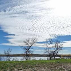 Am Wohnmobil zurück nehmen wir einen Mittagssnack ein, bis Schleierwolken die Sonne verdecken. Sonnenschein hat auch Nachteile, wie wir merken. Beim Losfahren entdeckt Dieter einen Riss in der Frontscheibe, die Sonneneinstrahlung hat offenbar einen Mini-Steinschlag zum Riss werden lassen. Darum werden wir uns in Winnipeg kümmern müssen.