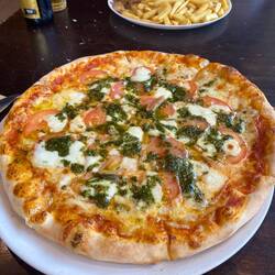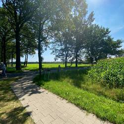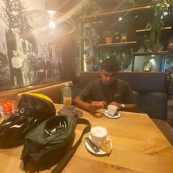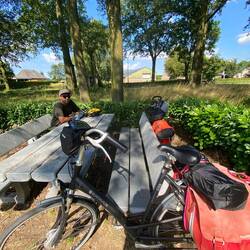 To end our day, we found a small “mini campground” just outside of Chaam, about 55 kilometers from Tom's home where we started. It was mostly for motorhomes, so we could only camp on the concrete space. But we were ready to rest, so we were happy with the spot. Plus, we had our own bathroom, which was pretty nice. After showering and getting ready, we rode into Chaam for dinner. When we got back on our bikes, we felt how sore our bums were – they were actually bruised and a bit swollen from getting used to the bike seats. But our hungry stomachs were more important, so we went to Chaam for dinner and to get out some cash to pay for the campground. We had a great dinner at a small place that served huge pizzas and delicious kebabs. There was a TV playing random channels in the corner, and about 10 minutes in, we heard Kiwi accents. To our surprise, "NZ Border Patrol" was on TV – the last place we expected to hear voices from home! Back at the campsite, we briefly met a lady who was born in Huntly, of all places.