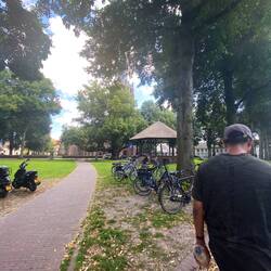 Anyway, we continued our ride, and it was fantastic. The bike paths around the main cities were very flat and well-paved. We stopped in Oirschot for coffee near a beautiful Gothic church as we left town. We also took breaks for water as we biked by canals, forests, and farmland. We had another break in Hilvarenbeek, where we got lunch from a supermarket and had more coffee (they always gave small biscuits and cakes with the coffee, and in Hilvarenbeek the cake was quite big!). We saw many churches along the way, and I really liked the little tunes they played before the bells rang each hour.