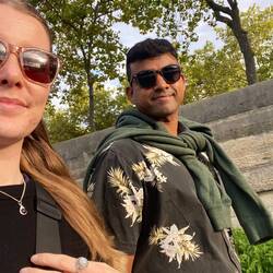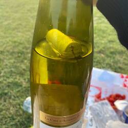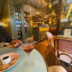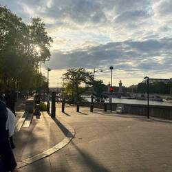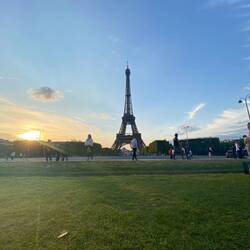 From the gardens, we began our long 'picnic crawl' through the 6th, Saint-Germain, 7th, and finally down the Quai d’Orsay towards the Champ de Mars in front of the Eiffel Tower. We wandered through markets, stores, and small streets with murals, all the while picking up little bites that together constituted a dinner. In Saint-Germain, we stopped for a quick aperitif and a rest before continuing towards the Seine. For dinner, we chose a baguette de tradition (I learned that the French make baguette ordinaire basically just for tourists. Why?!), a slice of pâté en croûte from a boutique charcuterie, and a few salami bites. We grabbed baby tomatoes, crackers, cheese, fruit, and wine from a supermarket. As sunset approached, we found our spot among the many in front of the Eiffel Tower, and a guitarist sang pop-folk covers of popular songs until the sunset and tower lit up, which was really nice and ambient. While setting up our dinner, I realized that the wine we'd bought was corked (like most of the wine in France 🤦♀️), and without a corkscrew, we fumbled trying to hack open the cork. Luckily, some Aussies sitting next to us offered us a knife, and they helped us MacGyver our way into the bottle. Good ol’ Aussies. We ended up drinking from the bottle with the cork floating inside of it…