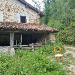 An einer einsamen Hausruine, direkt am Pilgerweg, trafen wir auf einen ebenso einsamen Stuhl. Irgendein Witzbold hat ihn wohl für müde Pilger zum Rasten hier hoch geschleppt, wir sagen Danke.