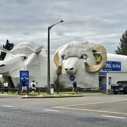 Hier fuhren wir durch. Tīrau ist als die „Welthauptstadt des Wellblech"bekannt. Die markantesten Wahrzeichen sind das riesige Gebäude in Form eines Schäferhundes (das dieLæs mere