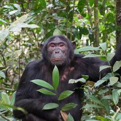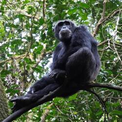 Nach einer Weile hören wir die Rufe der Schimpansen in der Ferne und Jane führt uns direkt in die richtige Richtung. Dort entdecken wir eine größere Gruppe hoch oben in den Bäumen. Sie frühstücken gerade und lassen sich dabei überhaupt nicht von ihren Beobachtern stören 🐵 Jane erklärt uns, wie die Tiere leben, und zeigt uns ihre Nester, die sie zum Schlafen bauen. Sie können zwar von Baum zu Baum hangeln, legen große Distanzen aber auf dem Boden zurück. Immer wieder hören wir ihre Schreie und so wissen wir, aus welcher Richtung einer der Primaten gelaufen kommen könnte, um zum Rest der Gruppe zu stoßen. So treffen wir einige Schimpansen auf dem Boden und können sie ganz aus der Nähe beobachten. Es ist total faszinierend, wie ähnlich ihre Mimik der unseren ist, und wir sind begeistert, unseren nächsten Verwandten auf Augenhöhe gegenüber zu sitzen. Wenn sie weitergehen, laufen wir mit entsprechend Abstand nach. Ist von außen betrachtet sicherlich ein lustiges Schauspiel: Ein Schimpanse, der durch den Dschungel läuft und einen Trupp Touristen im Schlepptau hat 👣