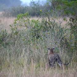 Dafür hat Sultan zum Sonnenuntergang eine besondere Überraschung für uns parat. Die ganze Zeit inspiziert er die hier typischen Kaktusbäume, da sie beliebte Ruheplätze für Leoparden sind. Und tatsächlich entdecken wir eine Leopardin auf einem der Äste liegen 🐆 Sie wechselt ab und zu die Position und wird sich erst später für die nächtliche Jagd bereit machen. Ganz in der Nähe im Gebüsch liegen ihre beiden Jungtiere, von denen einer ab und zu den Kopf hochstreckt. Wir beobachten das Trio fast eine Stunde lang und sind ganz aufgeregt, wenn sich was bewegt 😊