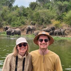 Nach der schlaflosen Nacht ist am frühen Morgen ein weiterer Game Drive mit Sultan geplant. Wir entdecken noch einen Leoparden im Baum und treffen auf richtig viele Elefanten, die unterwegs zum Kazinga-Kanal sind. Auf eben diesem Kanal machen wir später eine Bootsfahrt und sehen die ganzen Elefantengruppen wieder 🐘 Sie sind zum Trinken hier und sehen fast schwarz aus, wenn sie aus dem Wasser kommen. Danach reiben sie sich mit Staub ein, was als Insekten- und Sonnenschutz dient und ihnen die gewohnte graue Farbe zurück gibt.
