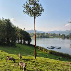 Unsere Lodge liegt auf einer kleinen Insel, die wir mit einem Boot erreichen 🛶 Hier können wir den Rest des Tages entspannen, gefühlt zum ersten Mal seit Beginn der Reise. Bei einem Spaziergang über die Insel entdecken wir Impalas und imposante Kronenkraniche, welche das Wappen Ugandas zieren. Und dann grasen hier auf einmal zwei Zebras! 🦓 Das war unerwartet, sie wurden wohl als Attraktion auf die Insel gebracht.