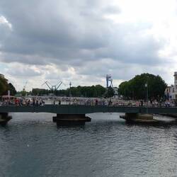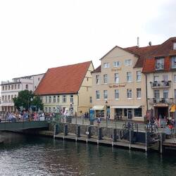 Durch die Alexandrinenstraße kommend geht es über die alte Drehbrücke über den Alten Strom Richtung Bahnhof.