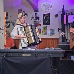 Später machten wir uns auf den Weg zur Taverne zum 11. Gebot – dort sollte an diesem Abend Livemusik im Biergarten stattfinden. Die Band „Edgar und Marie“ trat direkt dort auf, und tatsächlich, sie spielten schon, als wir ankamen. Wir setzten uns an einen Tisch zu einer Frau, und die Musik war schön. Edgar und Marie gesellten sich sogar zu uns an den Tisch, und so kamen wir ins Gespräch. Sie stammen aus Berlin und Meißen – ein richtig schöner Abend.