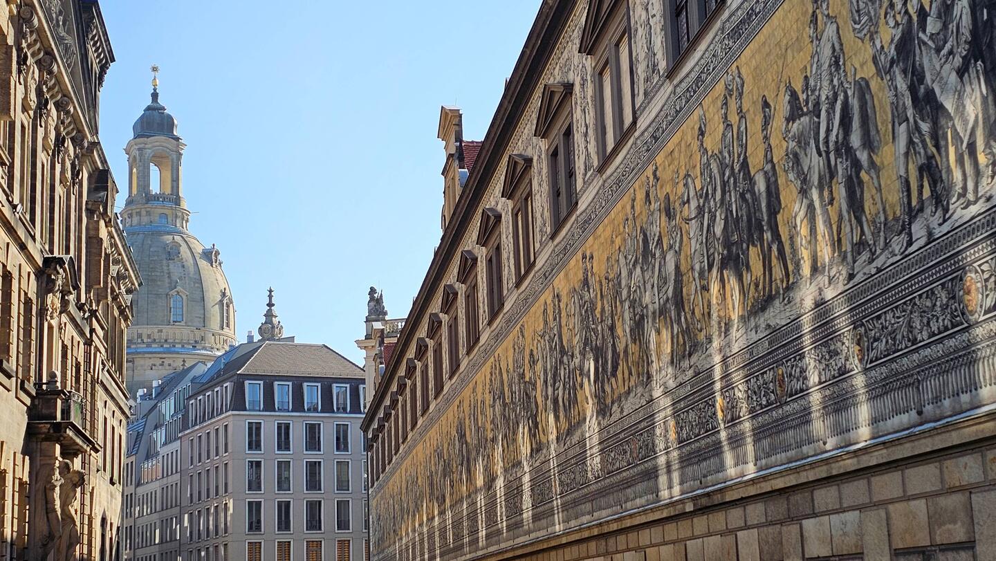 Dann sind wir über die Augustusbrücke in Richtung Altstadt gelaufen. Links konnte man die sogenannte „Porzellanmauer“ sehen – das ist der Fürstenzug am Stallhof des Dresdner Schlosses. ErRead more