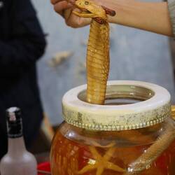 Etwas ganz neues für unsere Geschmackskosten gab es einen Tisch weiter... In einem großen Behältnis waren Schlangen, Geckos und Seesterne eingelegt. In kleine Pinnchen wurde dieser besondere Reisschnapps abgefüllt und wieder war Nina hier die mutige die probiert hat.