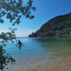 Nach der ersten Kletterei machten wir eine Verschnaufpause am Strand und fanden im Anschluss einen langen Steg- entlang der Felsen und über dem klaren Wasser-bis zur nächsten schönen Bucht.
