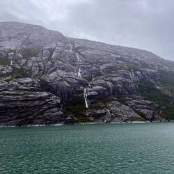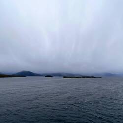 Um in den Fjord der letzten Hoffnung (und wieder hinaus) zu gelangen, muss man entweder die Kirke Narrows oder die White Narrows passieren. Beides nautisch sehr anspruchsvolle Passagen, da nur unter 100m breit und infolgedessen mit tückischen Strömungen versehen, da sich das Gezeitenwasser des Pazifiks durch diese „Flaschenhälse“ pressen muss. So ist diese Passage überhaupt nur bei Stauwasser zu durchfahren - also zu dem Zeitpunkt, an dem sich der Tidenhub innerhalb der Engstelle gerade umkehrt und die Strömung fast zum Stillstand kommt, ehe sie die Richtung wechselt. Um diesen Moment genau zu erwischen, ist unser Staff Captain mit einem der Zodiacs in die Engstelle gefahren, misst dort kontinuierlich die Strömung und gibt schließlich grünes Licht, sodass wir mit Schwung in eine 100-Grad-Kurve und durch das Nadelöhr gleiten können.