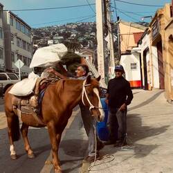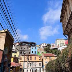 Keine Wertsachen mitnehmen wurde im Meeting gesagt, okay, das krieg ich hin. Ein Shuttlebus fährt mich zum Hafenterminal, wo ich genau durchleuchtet werde, ehe mich ein weiterer Shuttlebus ans Ende des Hafengeländes bringt. Dort schiebt ein freundlicher alter Herr ein recht provisorisch anmutendes Tor im Zaun auf und winkt mich hindurch. Ich stehe in Valparaíso – eine Stadt, deren einzige Assoziation bisher für mich ist, dass ein gewisser Dieter Mallinek in einem Reinhard Mey-Song eben genau hier hin auswandert, zusammen mit der Freundin von Reinhard Mey, die dann plötzlich nicht mehr seine Freundin ist. Und so habe ich den ganzen Tag dieses Lied im Ohr, während ich durch die Stadt laufe.