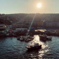 Als ich morgens die letzten Stufen hoch zum Sonnendeck erklimme, kann ich es schon hören. Nichts mehr mit Natur und Ruhe, wir liegen mitten im Industriehafen von Valparaíso, am Nachbarpier werden gerade riesige Karosseriebleche auf LKWs geladen, während sich die Silhouette der Stadt noch etwas schüchtern im Morgennebel an der Küste entlang schlängelt und schließlich dem Blick entzieht.