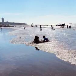 Viele Pärchen und Familien sitzen im seichten Wasser, quatschen und planschen, haben eine gute Zeit.