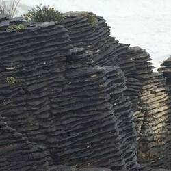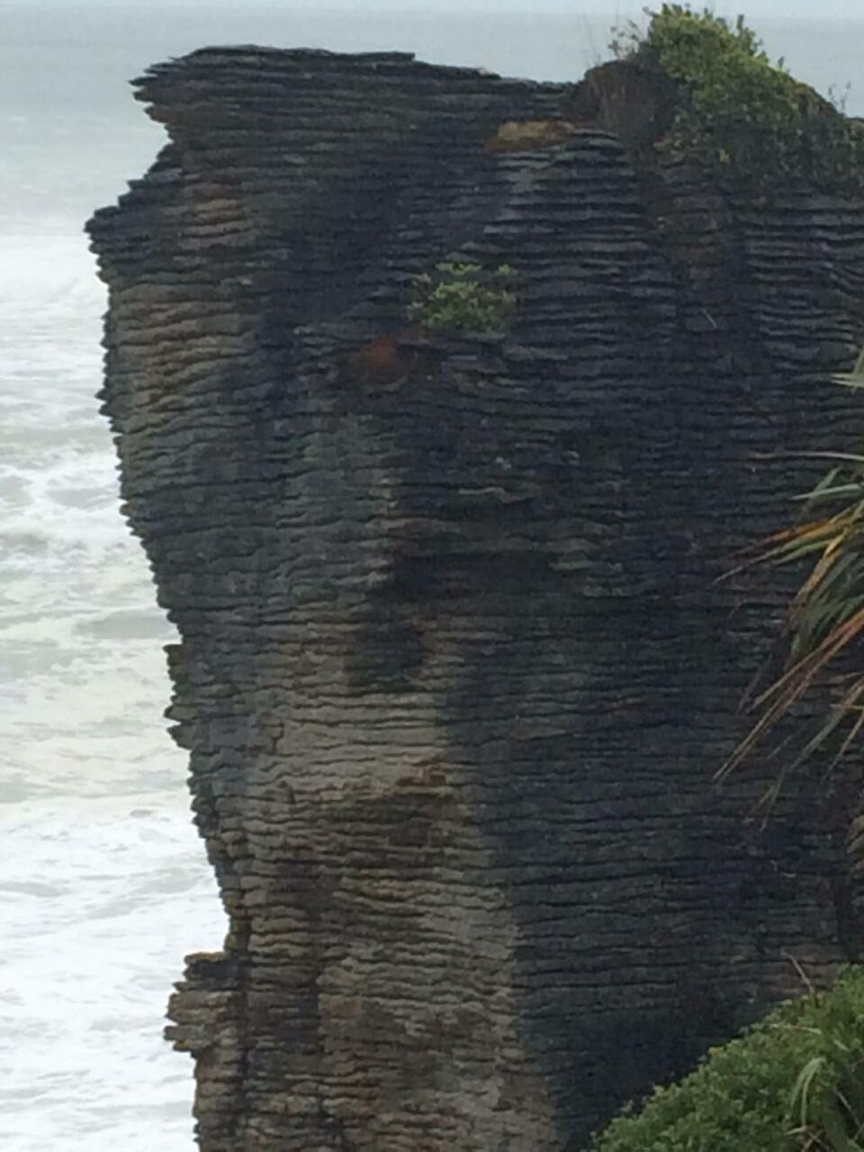 De rotsen bestaan uit gelaagde kalksteen die aan een stapel versteende pannenkoeken doen denken.