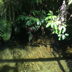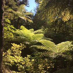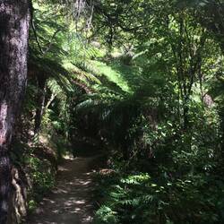 Veel varens, mos, bomen, kabbelende beekjes die je wel hoort maar niet ziet.