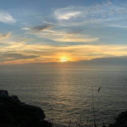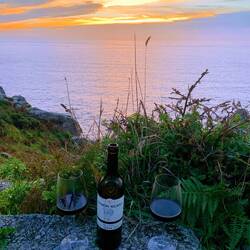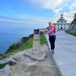 We’re at in Finisterre/Fisterra ( Galacian dialect ?). Ordering food at 3:19pm as we need to hike at 6:30pm up to the light house to be at the end of the world by 8:15pm, sunset🌅 with headlamps ( charged) and wine ready to go. 🌅🌅. A great finish!!!