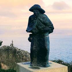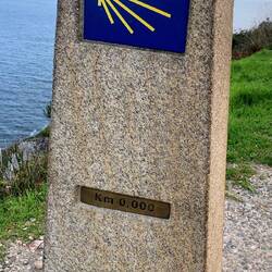 This early evening we bought a bottle of wine, our proprietress had wine glasses and an opener. We walked the about 3+km up and then down and the up was about 10 flights of stairs. A good evening walk ( see the monument/marker) up to the light house at the point Fin de Terre (the end of the earth) . It’s a separate Camino, so that marker there actually shows mile point 0.00.
