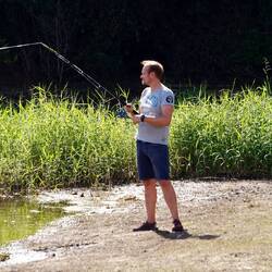 Kaum war unser Auto abgestellt und alles aufgebaut, war Aron schon am See und hielt die Angel ins Wasser. Die Fische ließen aber leider auf sich warten.