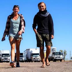 Lara fuhr ganz am Schluss des Konvois und hatte nach kurzer Zeit nicht nur Rinder um sich herum, sondern auch noch den Kühlergrill eines riesigen, drängelnden Roadtrains direkt hinter sich. Das beruhigt nur bedingt ;)