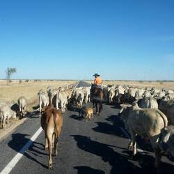Zwischendurch reiten dann aber auch Cowboys bzw. australische Drower auf Pferden durch die Herde, um die Rinder weiterzutreiben oder auseinander zu scheuchen. Und immer dabei: viele, viele Hunde.