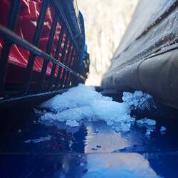 Auf dem kleinen Vordach unseres neuen Zeltes hatten sich zudem Unmengen an Eis gesammelt, die den Stoff nun in einer riesigen Beule nach unten drückten. Kurzerhand gab es also eine kostenlose Eisdusche - irgendwie muss das Eis ja wieder da runter!