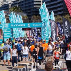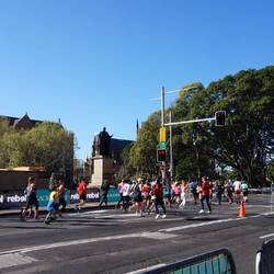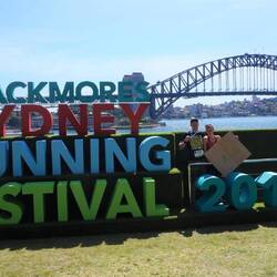 Die Laufstrecke ging zunächst südlich über die Hafenbrücke, danach ein paar lange Runden durch den Centennial Park im östlichen Teil Sydneys. Aus dem Park wieder heraus waren nun schon knapp 20 KM geschafft. Nun ging es wieder nach Norden um bei KM 25 hinter dem Ausgang des zentral gelegenen Hyde Parks Lara zu treffen. Sie feuerte kräftig an und überraschte Aron mit einem selbstgemalten Transparent :) „Go Aron Go“.