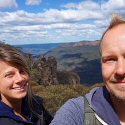 Ganz oben auf unserer Liste standen die Three Sisters in Katoomba. Das sind drei einzelne Bergspitzen, die aus einem Bergkamm direkt an der Klippe herausragen. Früher durfte dort geklettert werden, es wurde aber vor einigen Jahren verboten, um die Three Sisters zu erhalten.