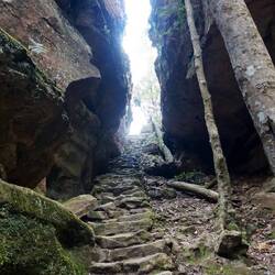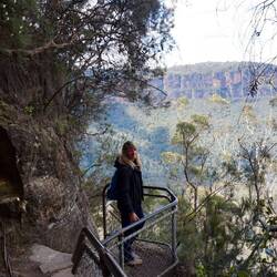 Neben den Three Sisters gibt es eine enge Treppe mit 900 Stufen, die einen direkt an der Felskante entlang, an hohen Eukalyptusbäumen vorbei, bis tief in die Schlucht zu einem Wanderweg führt.