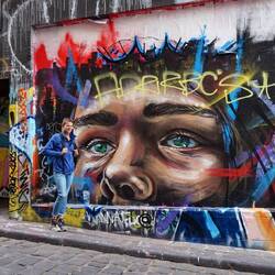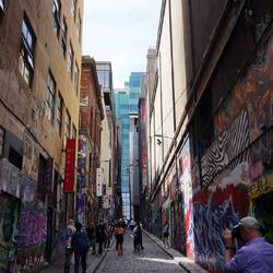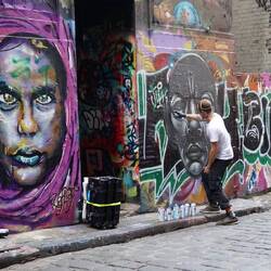 Auf dem Rückweg zum botanischen Garten besuchten wir noch die Hosier Lane, eine Querstraße in der die Wände rundum mit Street Art verziert sind und allerlei Kunstobjekte zu finden sind. Wir hatten Glück und konnten einem Künstler etwas bei seiner Arbeit zusehen. Andererseits ist dies wohl ein Highlight auf jeder Instagram-Tour und so trat man gerade vor den bunten Wandbildern anderen posenden Touristen sprichwörtlich auf die Füße. Leider total überlaufen mit Selfie-süchtigen Teenies…