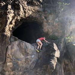 Trotz Hinweisschild war es nicht ganz einfach den richtigen Weg zu finden, das Gelände am Hang ist stark abschüssig und es sind mehrere alte Trampelpfade zu finden, die zumeist aber nach wenigen Metern im Nichts enden. Nach ein paar Versuchen hatten wir aber den richtigen Weg gefunden und standen 3 m unterhalb von einem tatsächlich etwas an eine Mondform erinnernden Höhleneingang.